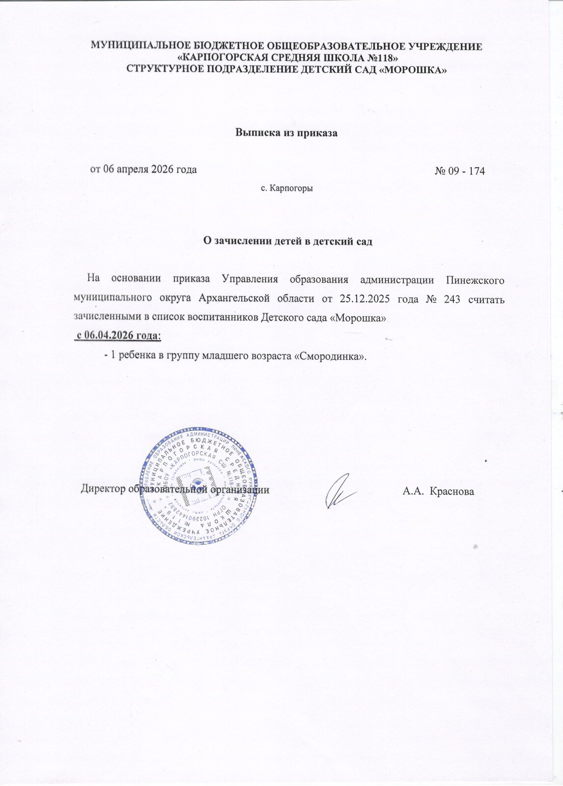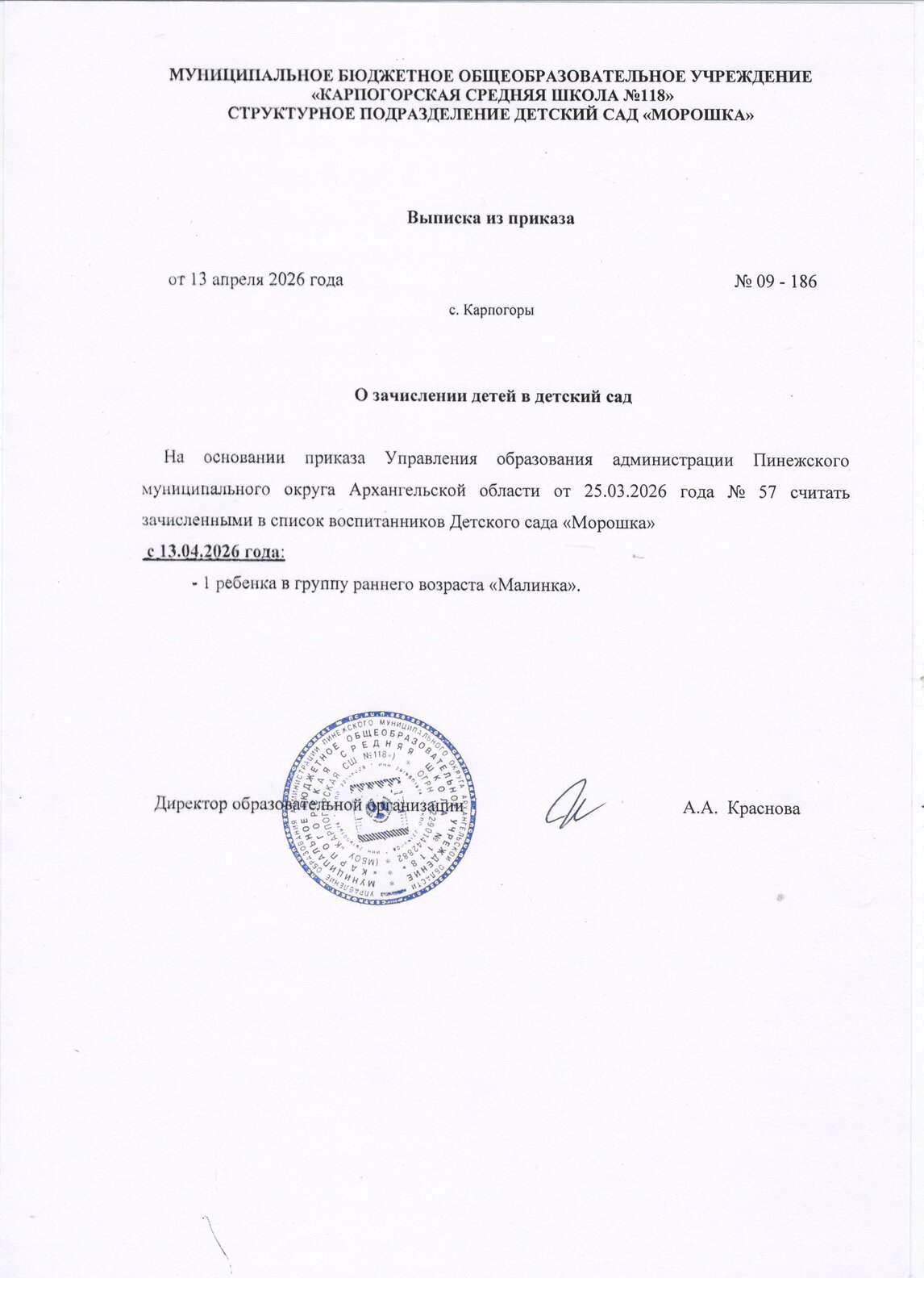Приказ об утверждении Положения о порядке перевода, отчисления и воссстановление обучающихся на получение дошкольного образования в МБОУ “Карпогорская СШ №118”