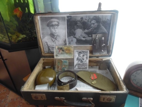 Небольшой старинный чемоданчик с уникальными документами, фотографиями и вещами. Что могло находиться в чемодане? С какими вещами солдаты возвращались с фронта? Давайте откроем чемодан и заглянем внутрь. Здесь собраны предметы, так или иначе связанные с солдатскими боевыми буднями: армейский котелок с фляжкой, пилотка, каска, кружка, ложка, записная книжка, солдатский ремень. Документы, награды, письма….