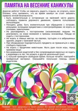 Наступают весенние каникулы. У ваших детей появляется много свободного времени. Поэтому считаем необходимым напомнить о правилах безопасности. Ведь именно Вы – ответственны за жизнь, здоровье и безопасность своих детей.